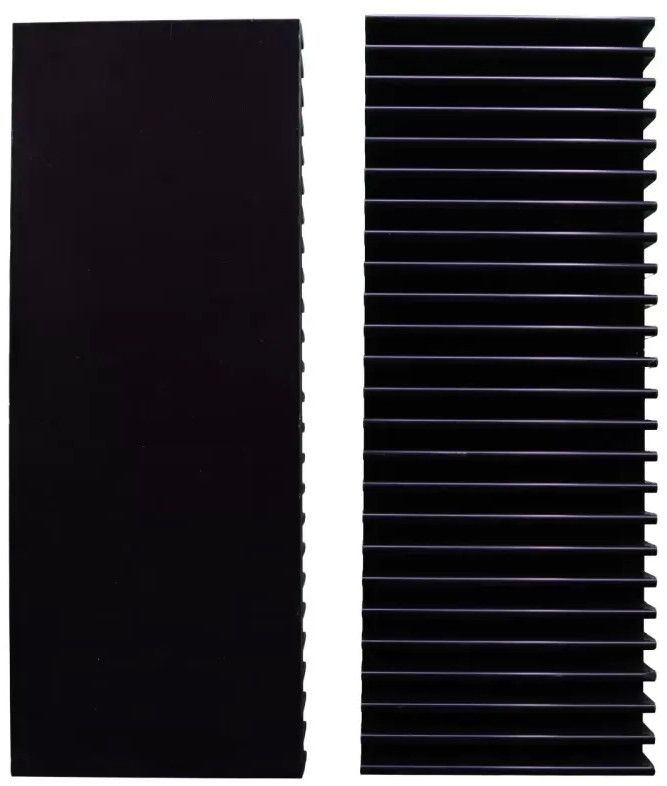 This black anodized aluminium heat sink plate of size 196mm x 100mm x 33mm and weight 830 grams with model number V1-THS-7-100-B is suitable for heavy audio amplifiers, UPS, Inverters or any other similar applications. This heatsink has a base thickness of 7mm that can be tapped to mount components with screws.